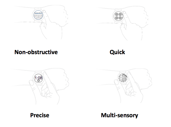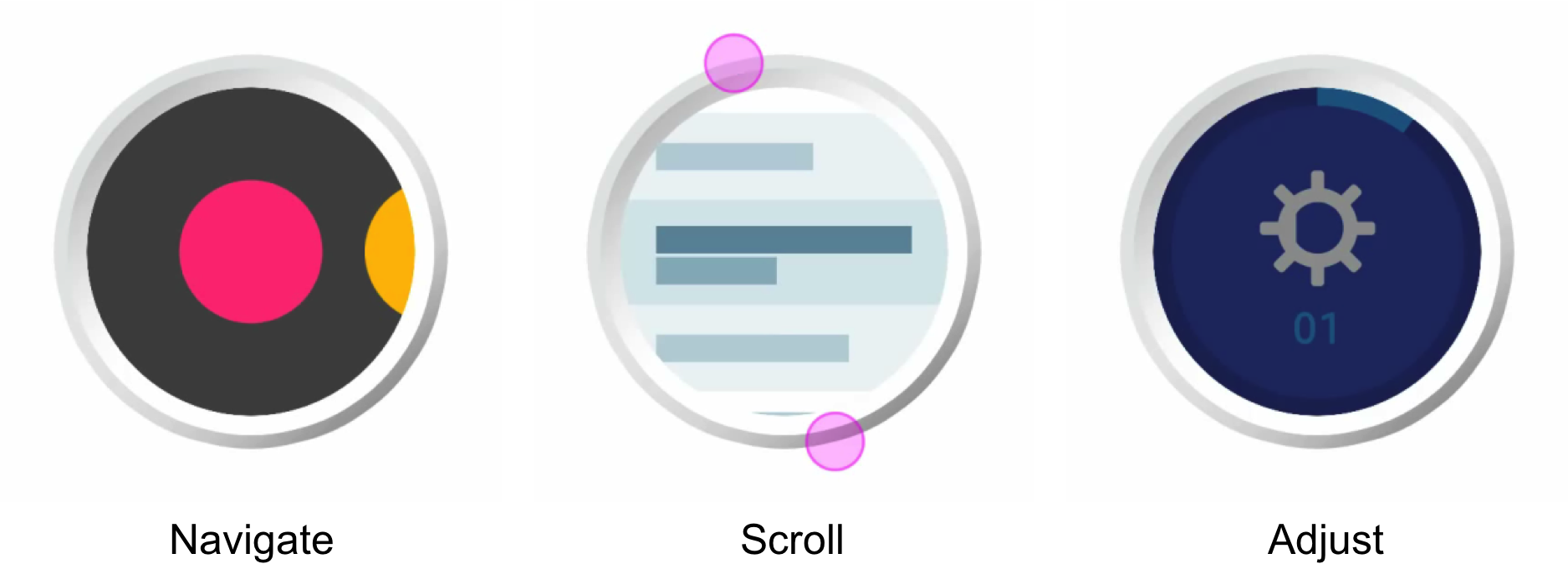The bezel allows users unimpeded access to information while navigating between screens. It also provides a tactile feedback along with a clicking sound when rotated. The bezel supports quick navigation; turning the bezel faster allows quicker navigation to the desired screen whereas slower rotation supports precise interactions within the screen. The illustration below provides a overview of the benefits on this new interaction.